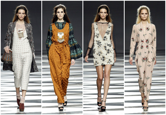 El siguiente desfile fue el de los hermanos Ailanto, los reyes del estampado. Empezando por la pasarela, de motivos geométricos, su colección para el próximo invierno se inspira en la obra del artista Lawren Harris. La prenda estrella es el mono, de diferentes cortes, escotes y estampados, que van desde lo geométrico a la botánica. Complementos en materiales naturales, como zuecos de madera o bolsos/cestos de mimbre.