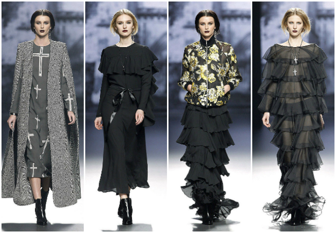 Juana Martín nos propone un invierno 2016-17 de luto y redención. De hecho, su colección se llama "Redemptio" y se inspira en esa tradición (tan de su Andalucía natal) de vestir de negro riguroso durante el periodo de luto, que al final es una redención, liberando el dolor después de una muerte. El minimalismo y lo barroco se mezclan en esta colección oscura, casi gótica, en la que las cruces tienen un gran protagonismo.