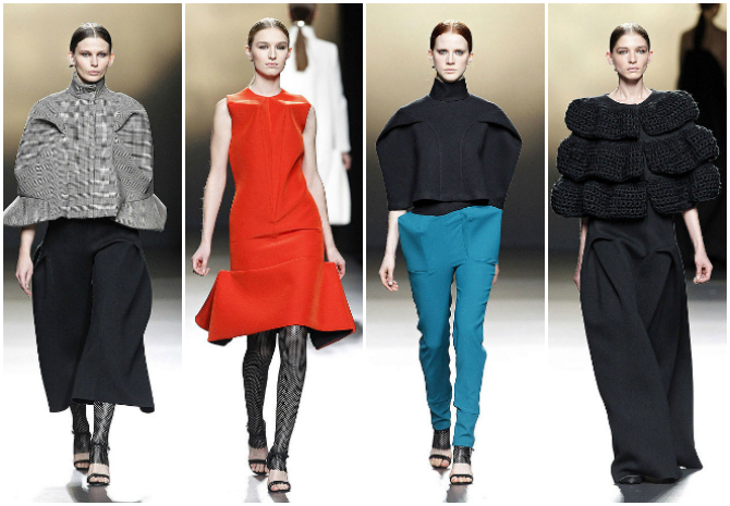 Amaya Arzuaga, fiel a su estilo, presentó una colección con sus clásicos "volúmenes imposibles" y pliegues magistrales, enormes solapas, tejidos gruesos en contraste con tul y medias de napa troquelada. El negro, como es habitual, es protagonista, pero también alguno de sus colores favoritos como el rojo, el azul o el rosa palo.